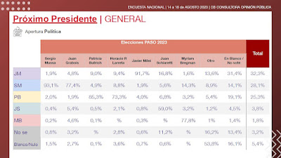 Milei y Massa logran altas tasas de fidelización del voto de sus respectivos sellos en las PASO (entre el 70% y el 90%), mientras que Bullrich enfrenta la situación más adversa. A diferencia de lo que concretó Macri en 2015, ella no logra retener todo el caudal de lo que logró la sumatoria de JXC en las primarias, por dos motivos: 1) no fideliza todo el voto de Rodríguez Larreta; según CB Consultora, la ex ministra retiene el 73,3% de los votantes de su contricante, según OPSA/UBA retiene el 60,5%, según Opinaia retiene el 56%, según Analogías retiene el 50% y según Synopsis (gráfico abajo) retiene apenas el 43,4% 2) para peor, también corre el riesgo de ceder parte de sus votantes, que podrían migrar a Milei al verlo como opción opositora de cambio más nítida: 12% según Opinaia, 9% de los votantes de la ex ministra están en esa situación, según CB, 18,1% según OPSA/UBA y 16,2% según Synopsis. En síntesis, más allá de algún matiz, las encuestas pos PASO coinciden en mostrar un crecimiento de Milei y de Massa, vs un retroceso de Bullrich. El libertario corre con la ventaja de una fuerza constituida en torno a su liderazgo, mientras que el ministro capitaliza el resultado de una interna “civilizada” con Grabois y, al igual que en 2015 pero esta vez con el sello oficialista, retiene el voto de su contrincante. Hasta ahora, LLA y UP disputan la posibilidad de construir la coalición ganadora mínima hacia octubre y de cara a un potencial ballotage. En cambio, la ex ministra de Seguridad capitalizó el corrimiento de JXC hacia la derecha en la interna contra el jefe de gobierno de la Ciudad Autónoma de Buenos Aires, pero ese mismo corrimiento pone ahora en riesgo parte de su electorado (público objetivo o target primario), que se siente motivado a votar a un candidato más radicalizado que ella (Milei), y a la vez le faltan argumentos para retener a los electores más moderados que necesitaría a efectos de construir una coalición ganadora mínima.sábado, 9 de septiembre de 2023