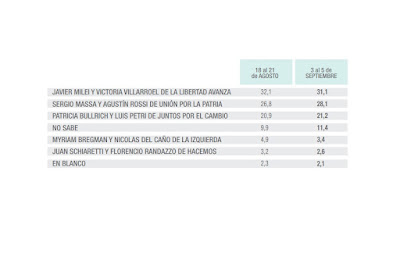 Esa variable arroja también una situación compleja para Schiaretti y Bregman, que sólo retienen alrededor del 60% de los votos de las primarias, mientras que el resto de su caudal podría migrar hacia otras opciones en octubre. Por otro lado, entre quienes en agosto votaron a otros partidos, 46% se muestra indeciso de cara a octubre y 19% podría migrar a Massa; Milei y Bullrich empatan en 11%. Entre quienes votaron en blanco, casi 60% está indeciso, mientras que 17% podría votar a LLA y 10% a UP. En tanto, entre los ausentes, un tercio se inclinaría por Milei, 27% se define indeciso, 16% podría votar por Bullrich y 11% por Massa.