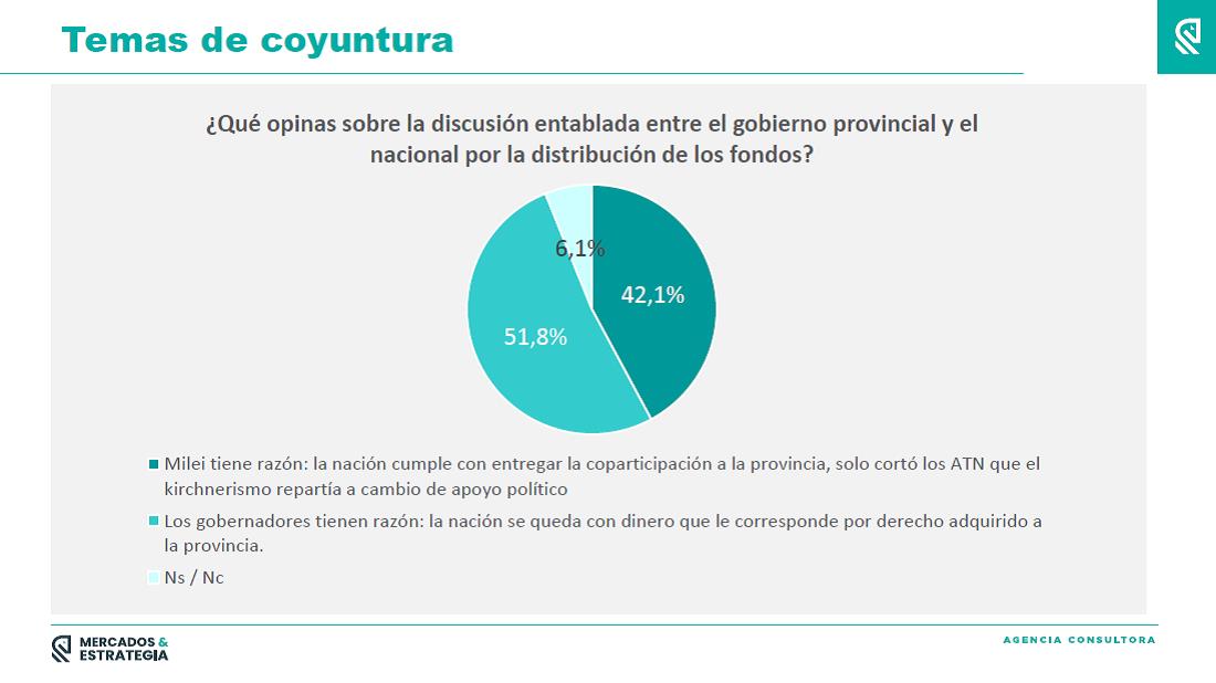 En este contexto en el que la demanda de consenso emerge por encima de las posturas extremas, las últimas medidas del oficialismo no ayudan: luego de haber recortado a las provincias recursos para transporte, educación y fondos discrecionales, la semana pasada el DNU 280/24 eliminó los artículos 92, 93 y 94 de la Ley de Presupuesto 2023 prorrogado para este año. Esos párrafos estipulaban que la Administración Nacional de la Seguridad Social (ANSES) debía transferir el día 20 de cada mes la doceava parte del déficit anual a las provincias que no hubieran transferido sus regímenes previsionales al Estado nacional. La medida afecta a las cajas de 13 provincias (Buenos Aires, Chaco, Chubut, Córdoba, Corrientes, Entre Ríos, Formosa, La Pampa, Misiones, Neuquén, Santa Cruz, Santa Fe y Tierra del Fuego) e implica una nueva vuelta de tuerca al conflicto que arrancó en febrero y que alcanzó su pico con el cruce entre Ignacio Torres (gobernador de Chubut) y Milei. La encuesta realizada en marzo por la consultora Mercados & Estrategia en la Patagonia detectó que casi 52% de los electores de esa región le dio la razón a los mandatarios provinciales, aventajando por casi a 10 pp a quienes se inclinaron por el presidente (gráfico arriba).